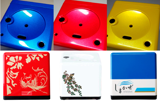 ⾃動⾞部品や化粧品容器、家電部品などの⽣産経験を活かした塗装技術で加⼯⻘、⾚、⻩など多彩なカラーバリエーションに加え、オリジナル色の調色も可能です。その他漆調、メタリック調、パール調など高級感を演出する加⼯や光沢感、艶消し感の調整も出来、印刷でオリジナルロゴや模様もプリントし、お客様のご要望をお聞きし独⾃のデザインに仕上げます。